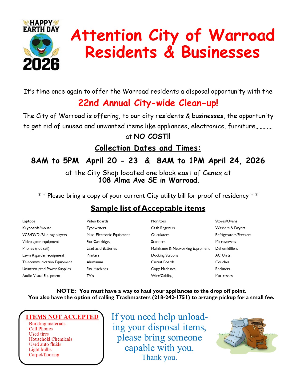 It’s time once again to offer the residents in the City of Warroad a disposal opportunity with 22nd Annual City-Wide clean-up! The City of Warroad is offering, to our city residents & businesses, the opportunity to get rid of unused and unwanted items like appliances, electronics, furniture, etc. at NO COST!!