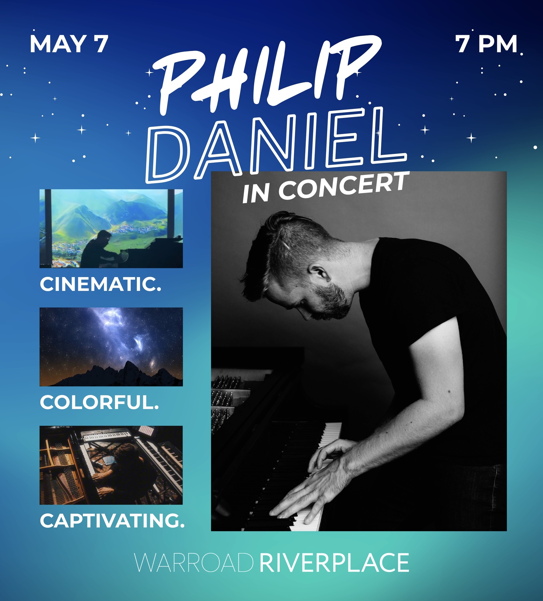 Pianist and composer Philip Daniel transforms live music into an immersive journey, blending original piano compositions, electronics, and subtle percussion with a stunning digital visual display. As he performs, RiverPlace will come alive with waves of color and cinematic imagery, inviting the audience to fully experience the performance. Rooted in classical training and shaped by modern film and minimalism, his music is both powerful and deeply evocative, creating an atmosphere that stays with you long after the final note.